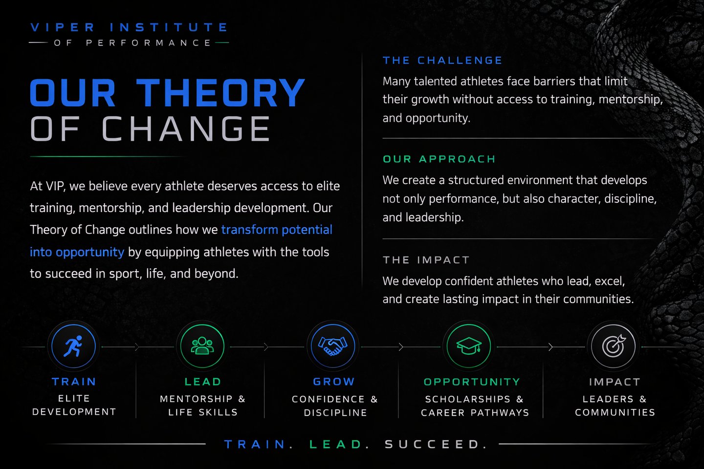Viper Institute of Performance (VIP) is a Rhode Island–based nonprofit organization dedicated to empowering youth through athletics, academic development, and mentorship. VIP exists to provide student-athletes ages 10–18 with access to high-quality training, leadership development, and life-skill education that prepares them for success in college, careers, and their communities.